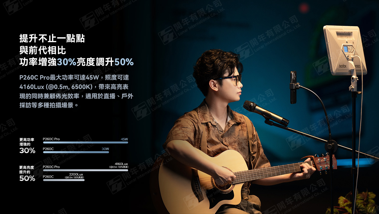 最大功率可達45W,照度可達4160Lux (@0.5m, 6500K),帶來高亮表現的同時兼顧佈光效率,適用於直播、戶外採訪等多種拍攝場景。