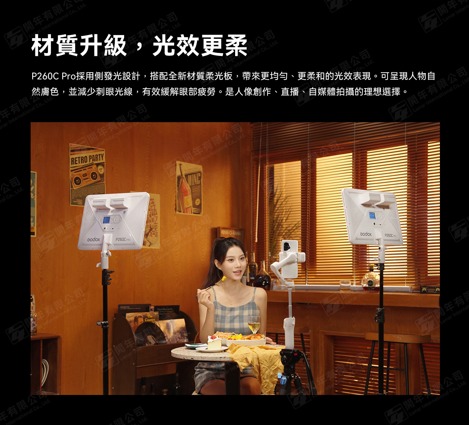 採用側發光設計,搭配全新材質柔光板,帶來更均勻、更柔和的光效表現。可呈現人物自然膚色,並減少刺眼光線,有效緩解眼部疲勞。是人像創作、直播、自媒體拍攝的理想選擇。