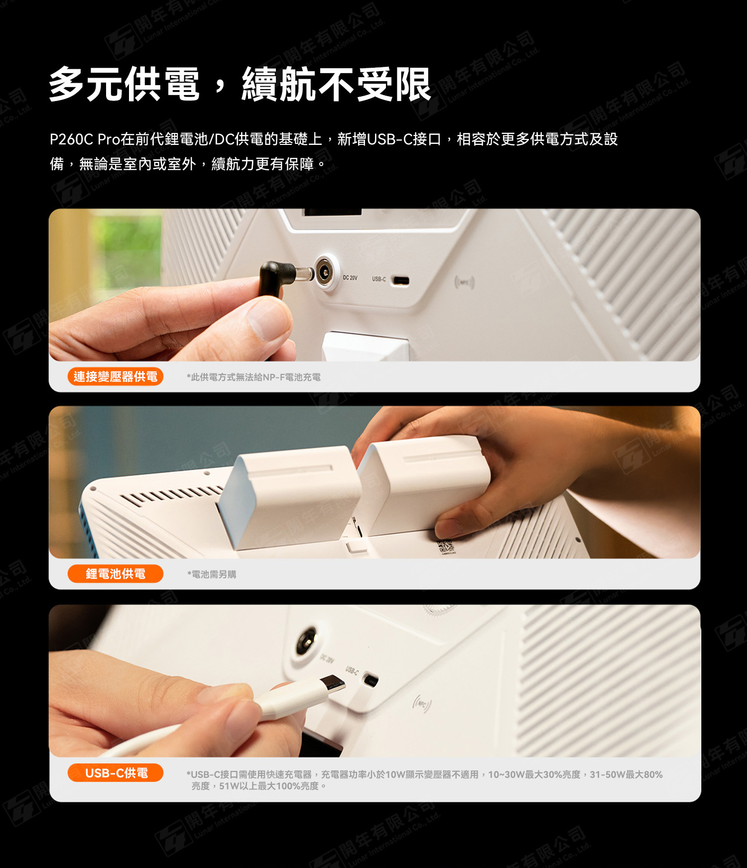 .多元供電,支援Type-C、NP-F電池、DC供電