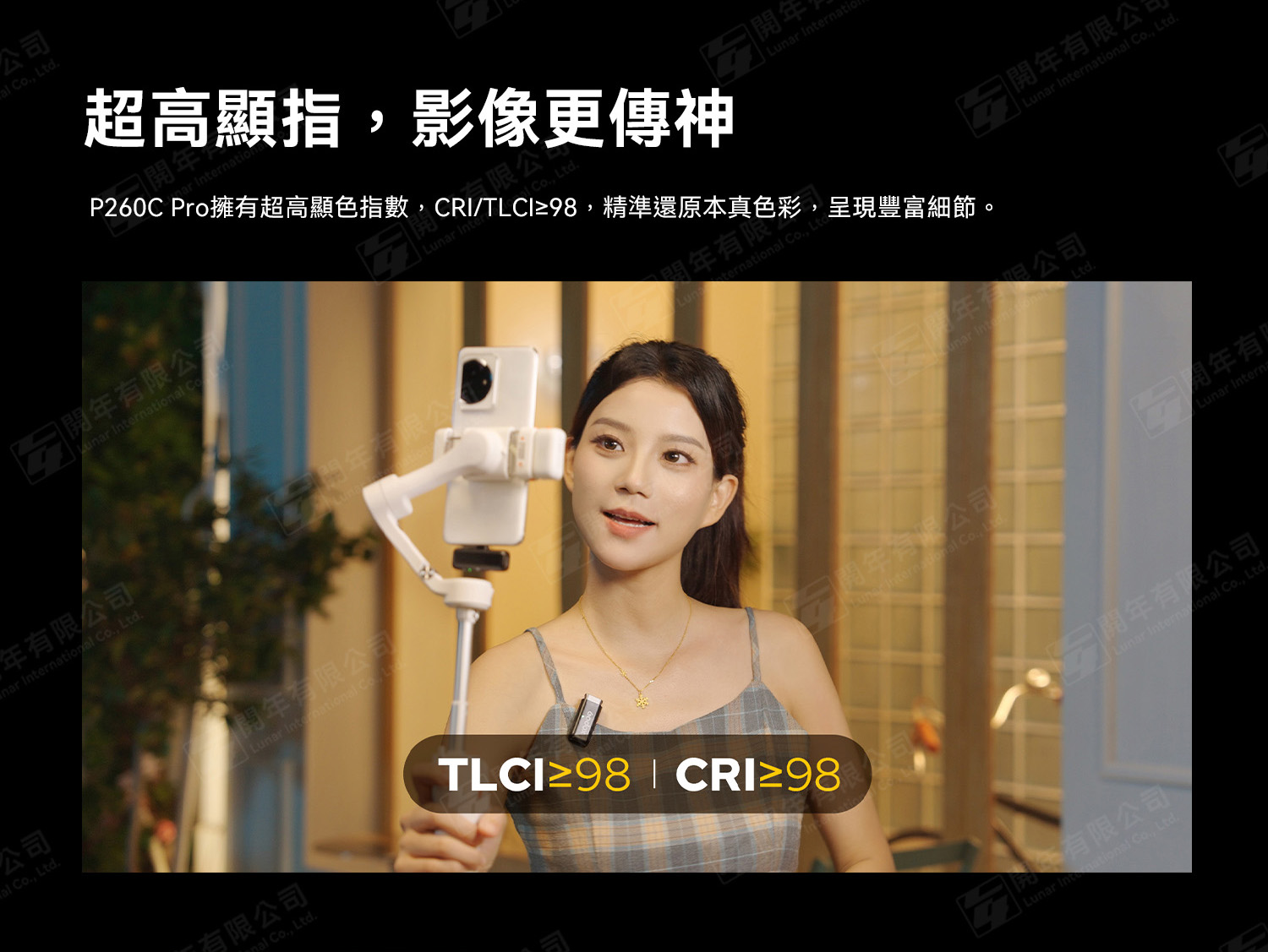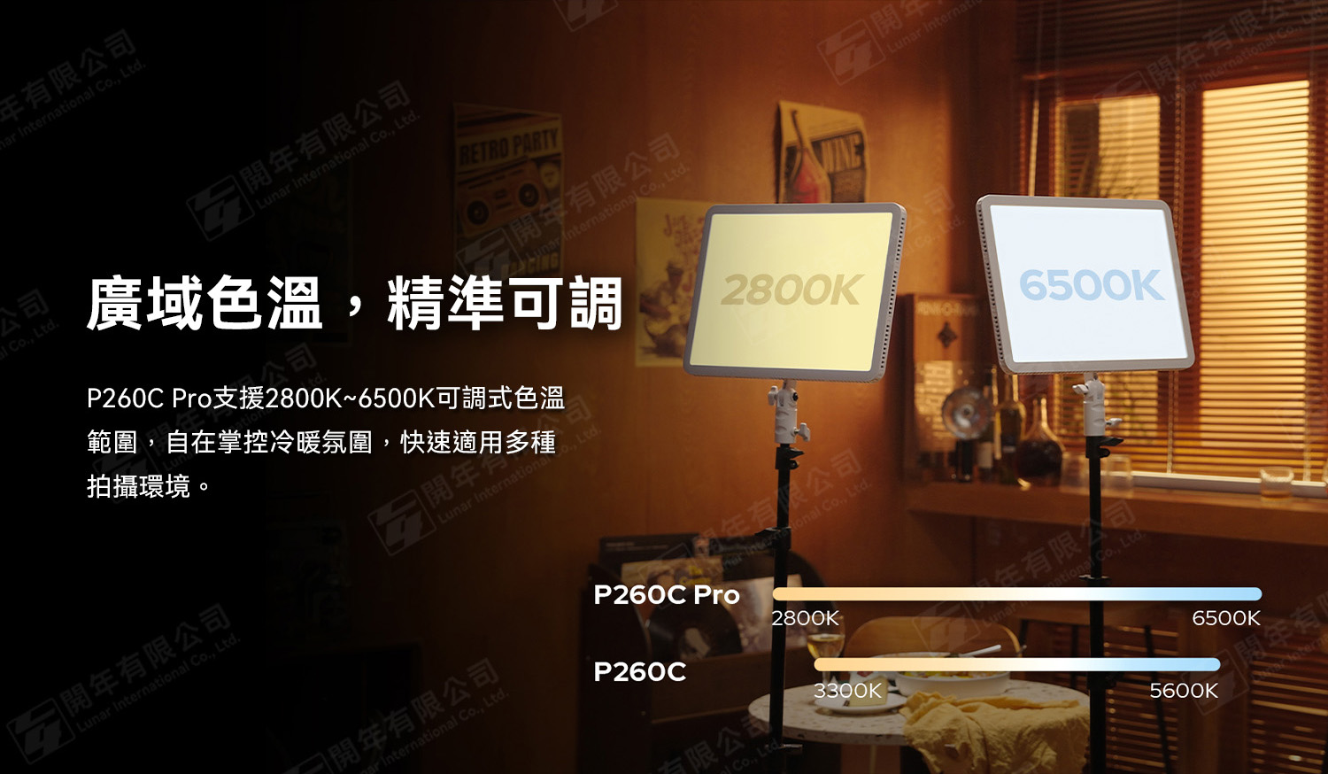 P260C Pro支援2800K~6500K可調式色溫範圍,自在掌控冷暖氛圍,快速適用多種拍攝環境。