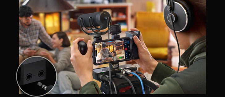Blackmagic Camera ProDock擁有一路3.5mm音頻輸入,當您需要使用指向性更強的麥克風時,可以搭配優質手持、領夾式或超指向麥克風。您還可以在現場使用3.5mm耳機插孔監測音效!