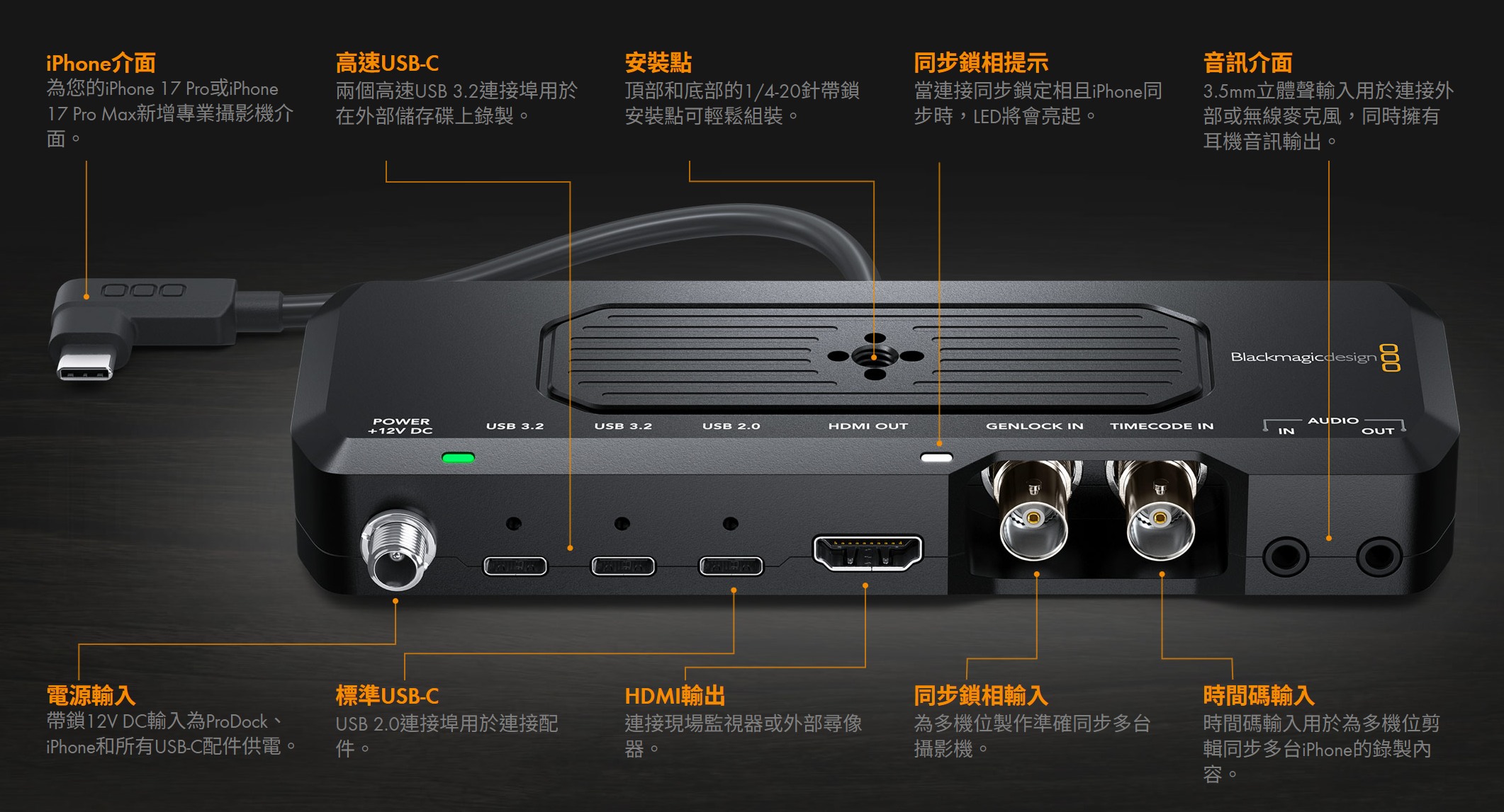 Blackmagic Camera ProDock將您的iPhone 17 Pro和17 Pro Max變身成一台專業製作攝影機,擁有搭建自定義裝備所需的一切介面。同時它也支持iPhone版Blackmagic Camera App!您將獲得HDMI監看、麥克風、耳機、同步鎖相介面以及連接外部存儲盤和電源的USB介面! `