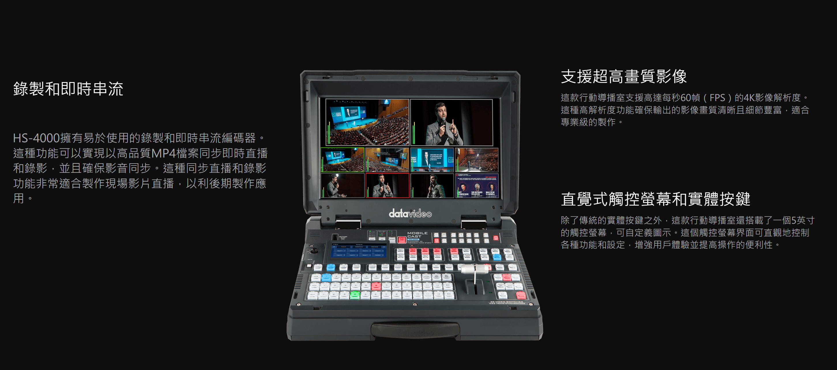 HS-4000將影像導播機、聲音混音器、螢幕、錄影機和串流編碼器等功能,集成於一,使用戶能夠更輕鬆地製作高品質內容,而無須使用多項不同功能的設備,組建複雜的作業流程。