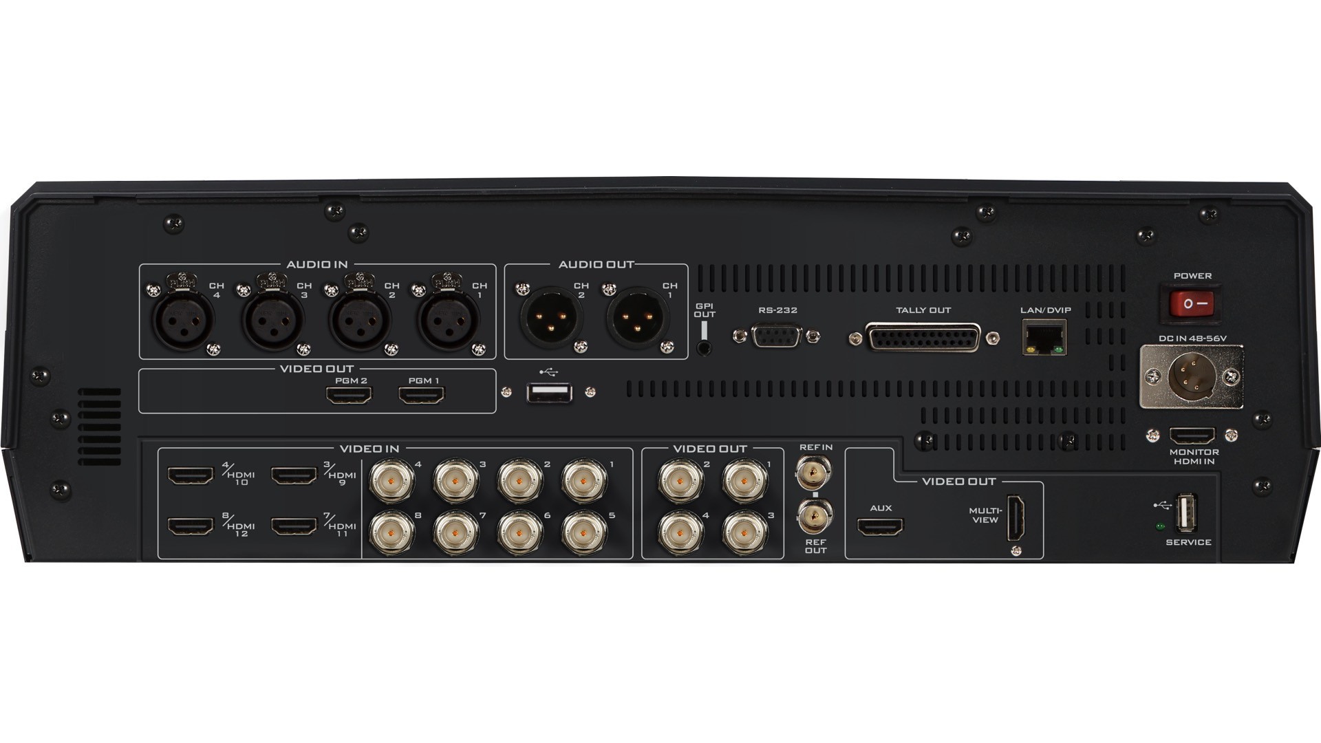 HS-4000具有12個影像輸入,其中8個輸入可進行靈活選擇,還有多種影像和聲音輸入/輸出,以及7個帶輔助指派功能的輸出。