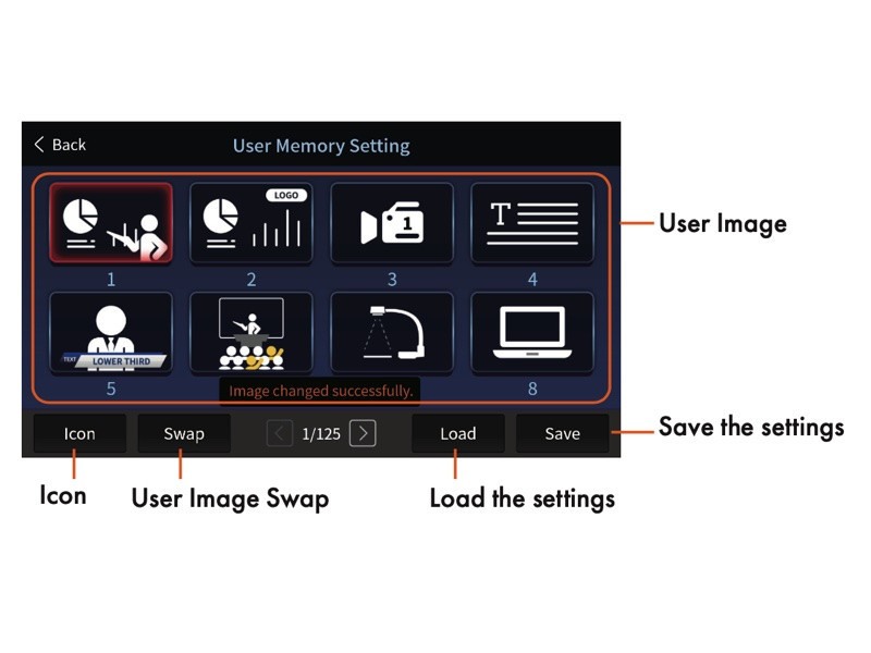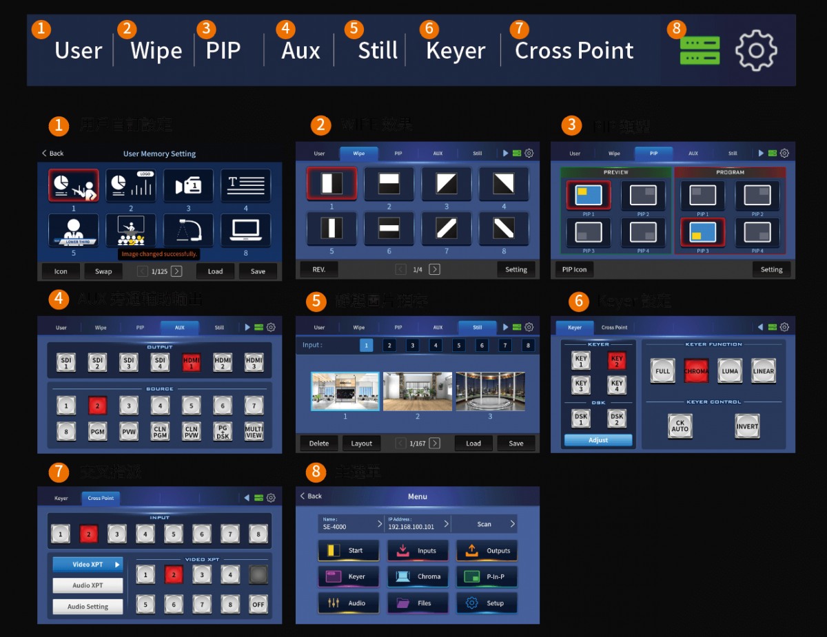 能記錄每一個訊號來源的狀態以及子母畫面等參數設定,並且可以使用「用戶自訂義圖標替換」功能,即在設定好之後替換圖標,提供使用者更直覺的辨識並利用該參數設定。