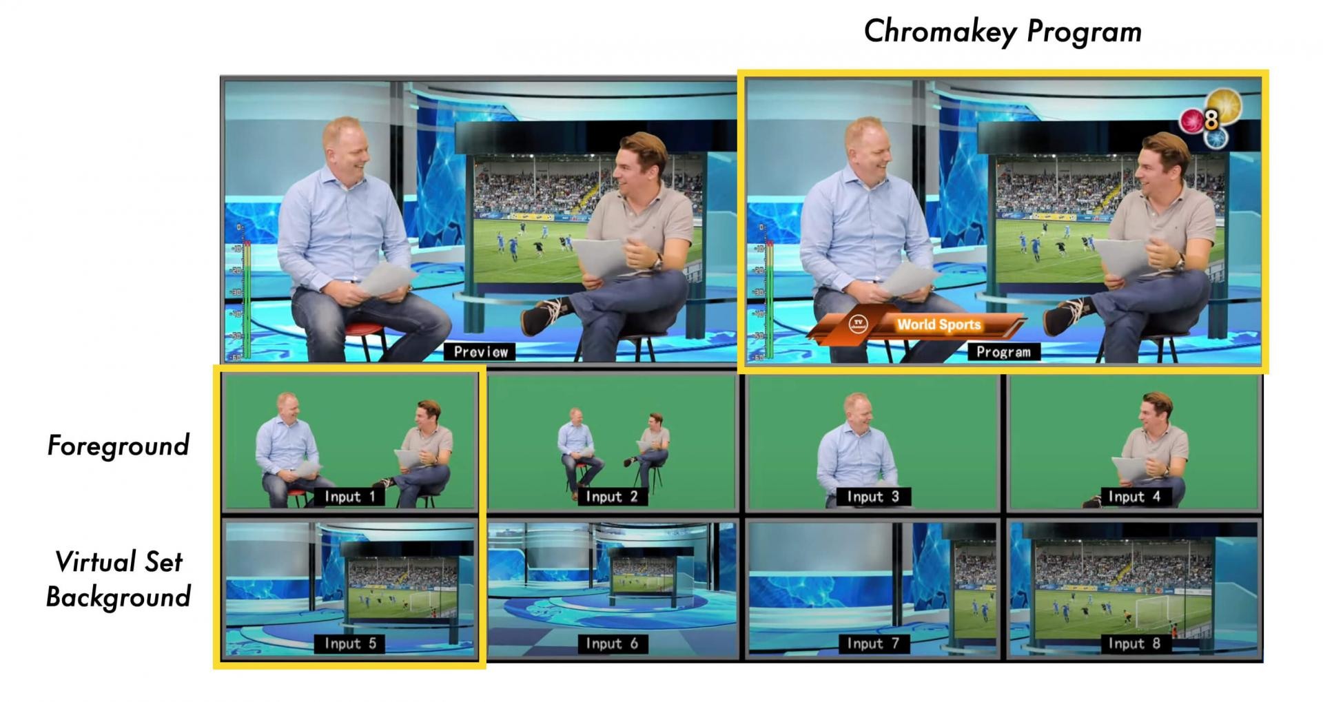 一鍵呼叫,瞬間切換所有去背的設定參數,帶來如同多機位去背機的全新操作應用,用一台HS-4000導播機就能實現多機位虛擬攝影棚製作。