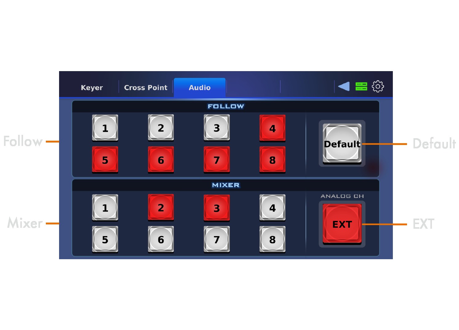 可自由設定影像或是聲音的交叉指派 (Cross Point),重新依照操作者習慣進行排序,在配置編排影音呈現上提供更大的靈活性。