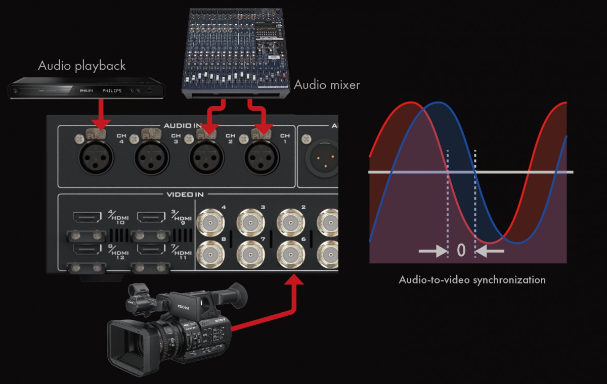 HS-4000內建專業的聲音延遲器,可適度的延遲、重新校準聲音訊號,讓畫面嘴型對的上聲音的傳遞,完美精準同步影像與聲音訊號,讓現場大型螢幕的畫面顯示,與多聲道揚聲器的