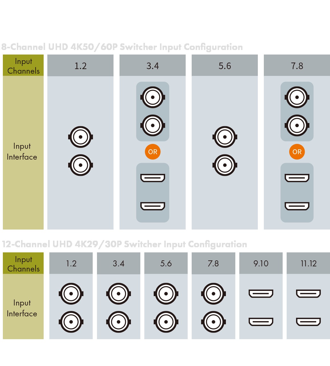 快速來源切換功能,可將四路 12G-SDI 或 HDMI 2.0 訊號來源,做即時、無縫的訊號來源切換,在原始 8 路的思維下,提 升為 12 路的應用框架,將硬體靈活性發揮到極緻,也為您的現場製作增添更多可能性。