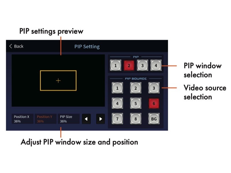 內建兩組 PIP 子母畫面編排構成效果,可 同時疊加顯現,除預設的角落位置之外, 更可隨心所欲的自由設定大小、位置、與顯示比例,亦可裁切子畫面為方形顯示。