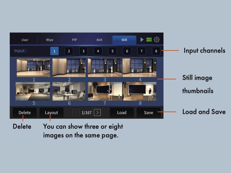 高達 250 張靜態素材儲存空間 (UHD 4K), 讓您可以盡情預存節目串場圖片,各種情景素材圖片,或是全幅 Logo 形象圖片,校徽、科系圖標等等