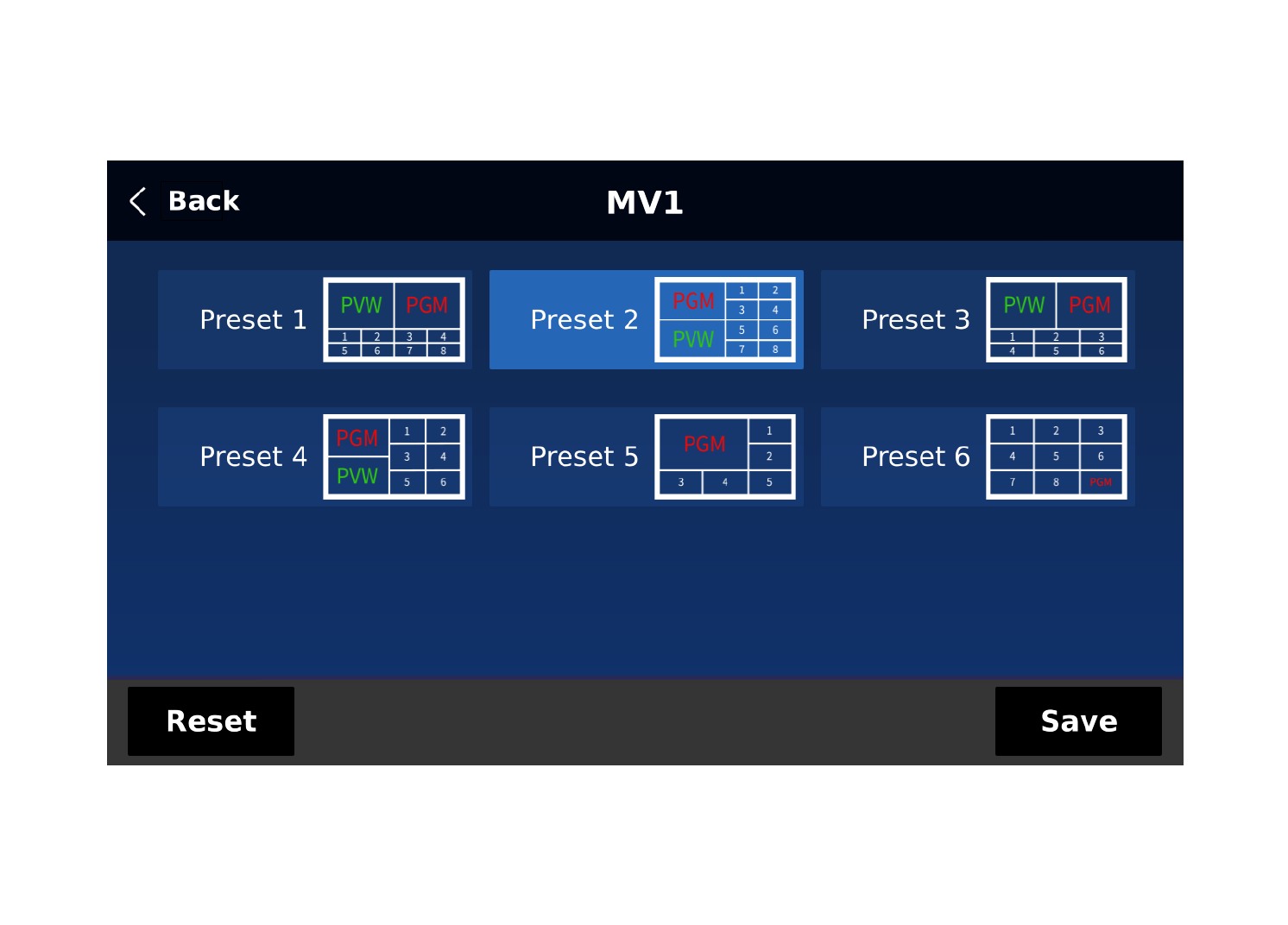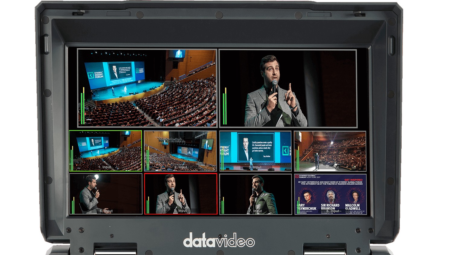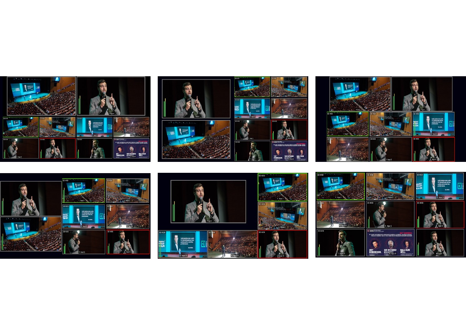 Datavideo 4000 系列導播機提供六種不同編排 方式的多分割監看畫面,這些不同排列方式的多分割畫面為用戶在調度和監看多組影像畫面時賦予靈活性,提升導播機在各種影片製作情境中的 整體易用性。