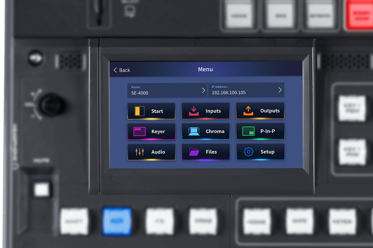 5”觸控螢幕可以調整許多功能,包括色度去背、亮度去背、下游鍵設定、子母畫面、3D 轉場特效、WIPE 特效、靜態圖 片儲存以及圖片插入。這些都可以透過 5 英寸