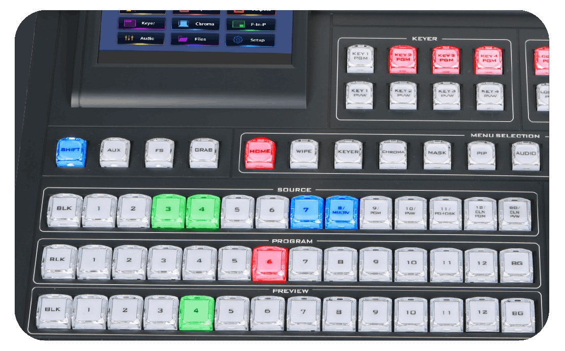 HS-4000 提供專用的SOURCE來源選擇按鈕,讓操作員無需進入選單或使用快捷鍵組合即可切換影像來源。這項設計可降低直播製作中的操作錯誤風險,確保工作流程更順暢,穩定性更高。