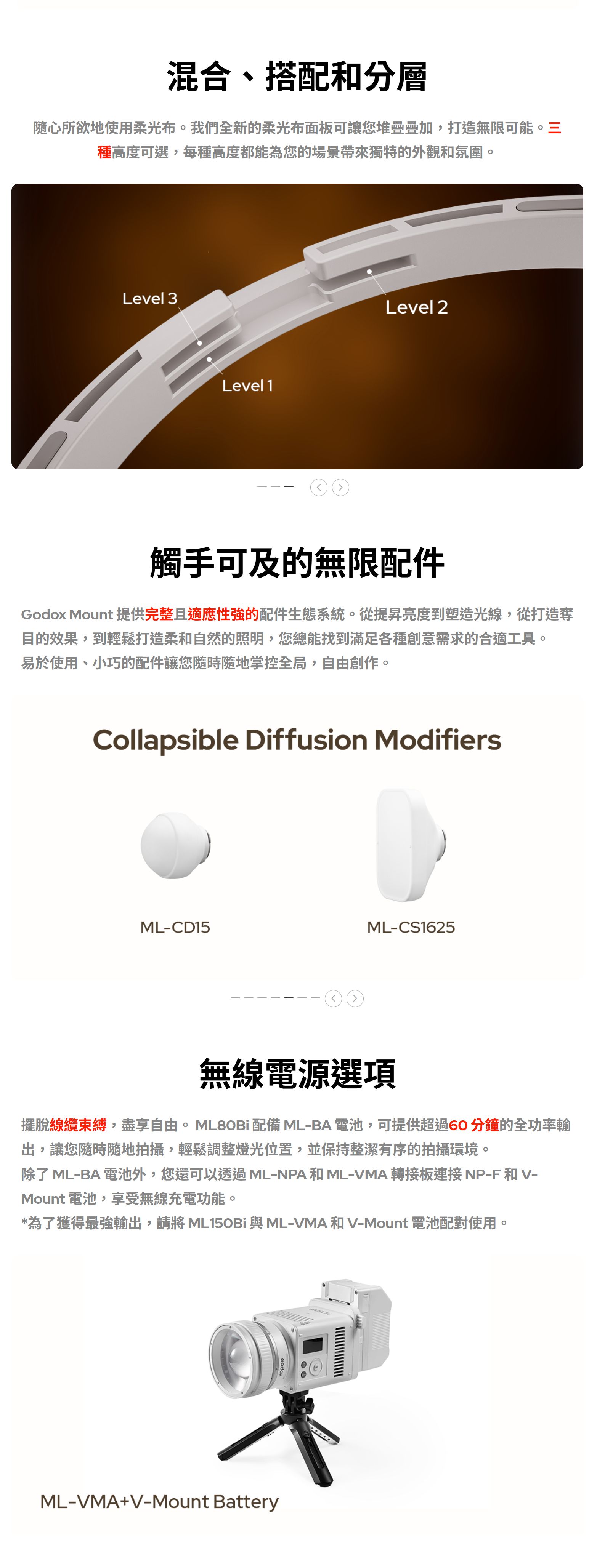 ML系列採用全新模組化架構,支援多種電池系統,包括ML-BA直插電池、V-Mount與NP-F轉接板,讓使用者可依拍攝場景自由選擇供電方式。燈體本身無需手柄即可獨立運作,大張提升機動性與安裝效率。