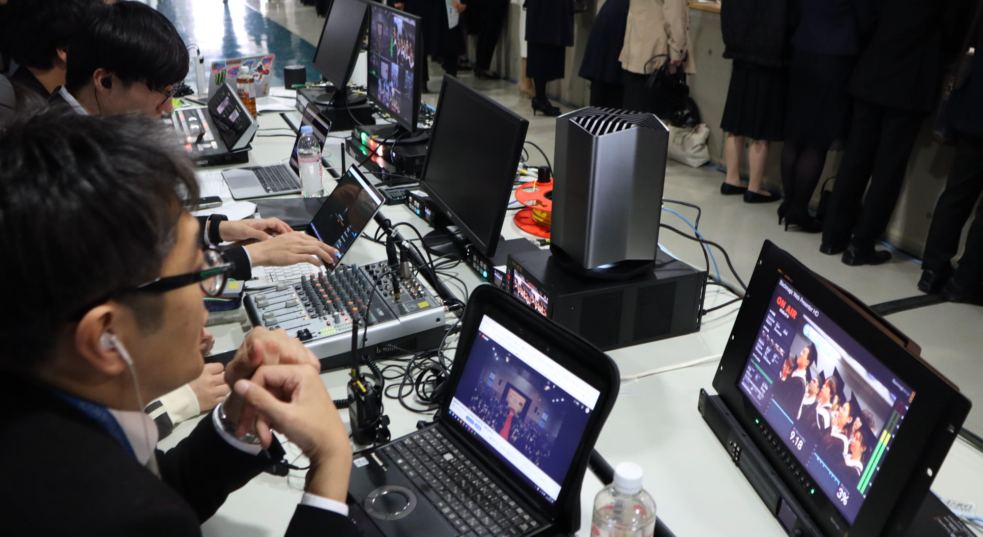 來自媒體研究學院的寺本卓史教授解釋說:所有播出製作都是由我研修班的學生負責完成的。一開始,我們使用的是非常小規模的單機位製作,並且拍攝素材需要拆分成多個30分鐘的片段,然後通過FTP上傳用於播放。而現在,我們使用YouTube作為播出平臺,並且採用多機位元畫面切換方案。除了為日本和海外的學生家長提供直播畫面之外,還有許多無法親臨典禮現場的教職員工也可以在校園內觀看直播,因此直播需求量很大。除了製作各類典禮活動之外,學生們還會參與多家公司的直播項目,從而更好地將課堂內容和實際操作相結合。