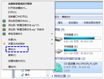 第八步:若需要結束投影,請打開電腦桌面上的「電腦」圖標,找到名稱為「EPSON_PJ_QW」的可移動儲存裝置圖標,用滑鼠右鍵點擊它,選擇「EPSON_PJ_QW