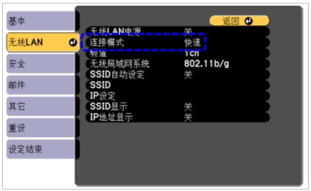 2. 透過投影機遙控器上的「Menu」按鍵進入選單,找到並進入「網路設定」選單,進入「無線LAN」標籤頁;