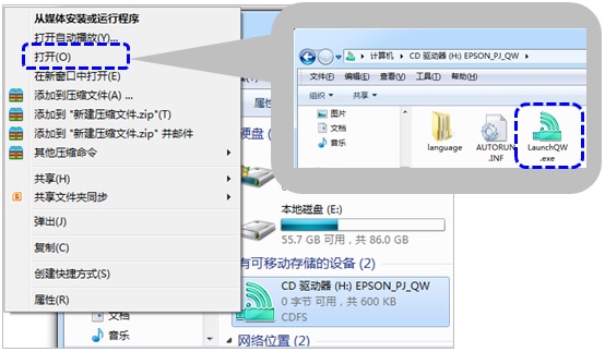 Key後若沒有自動執行軟體安裝程式。請開啟電腦桌面上的「電腦」圖標,找到名稱為「EPSON_PJ_QW」的可移動儲存裝置圖標,用滑鼠右鍵點擊它,然後選擇「開啟」。雙擊執行“LaunchQW.exe”檔案。如圖7所示