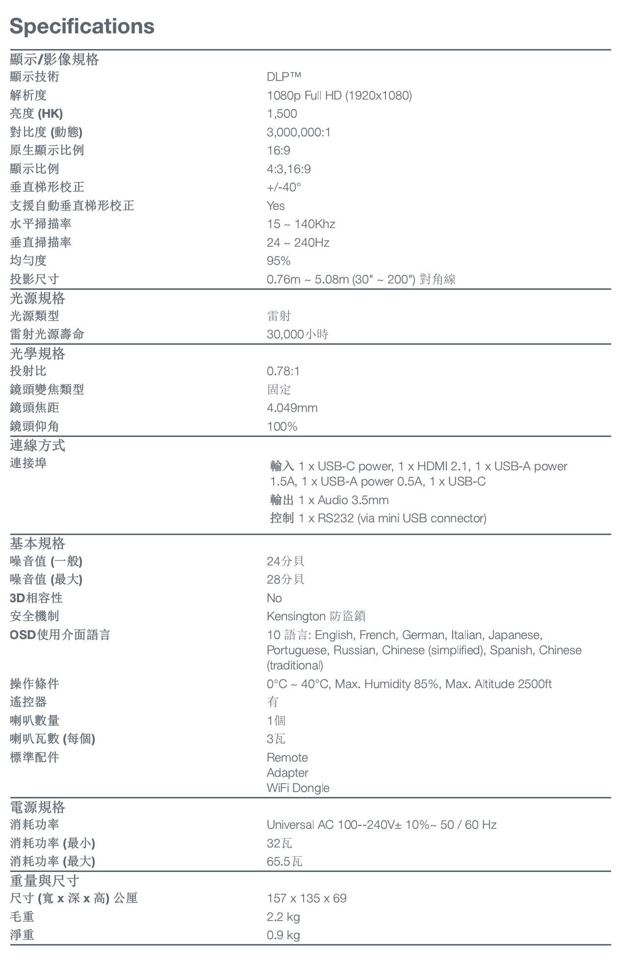 ¹ 需要相容的外部電池才能在戶外使用,建議外部有防水盒保護,皆需另行購買。² 以 Optoma 同等亮度和 DCI-P3 色域水平的的燈泡投影機比較。³