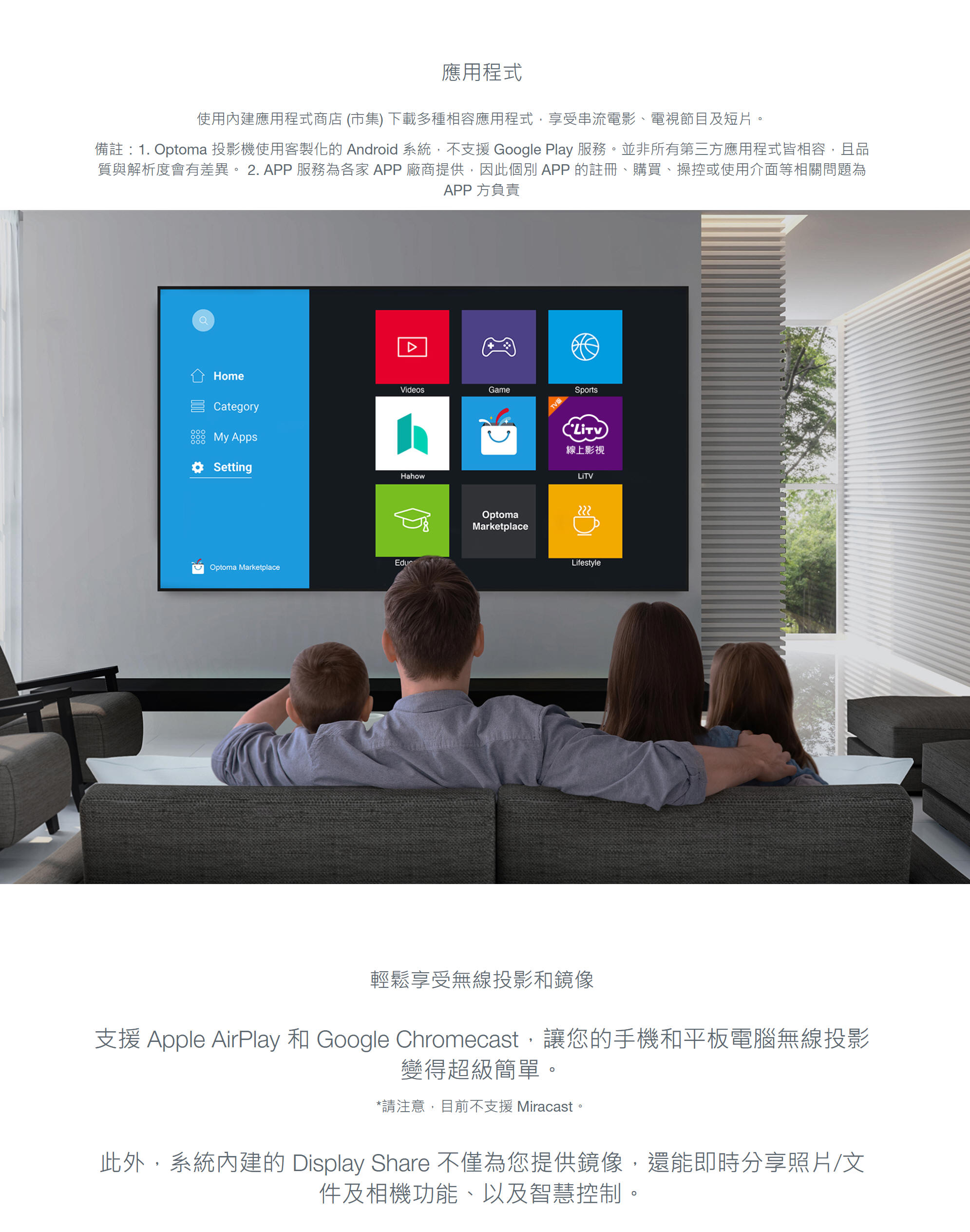 使用 Optoma Display Share應用程式或桌面軟體即可在大螢幕上無線顯示和分享內容。