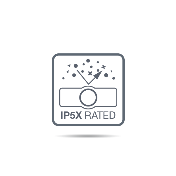 採用Optoma新一代通過 IP5X等級國際防塵認證的密閉式光學引擎,能夠高效阻絕空氣灰塵並且確保長效使用的效能性,免除需經常性維護或更換維修的困擾。