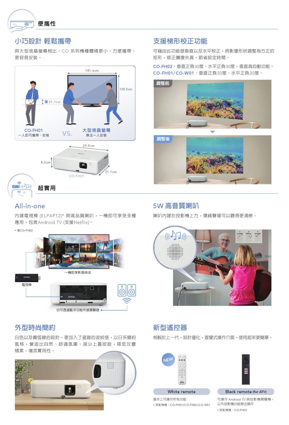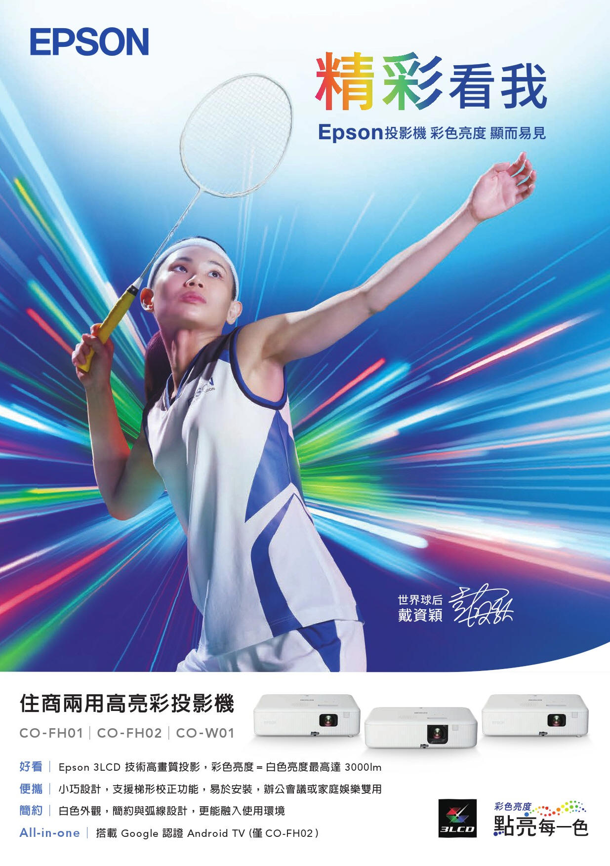 CO-FH02住商兩用投影機,採用3LCD投影技術,「白色亮度」及「彩色亮度」都達到3,000流明,投影免觀燈,不論從哪個角度觀賞,影像皆艷麗清晰。