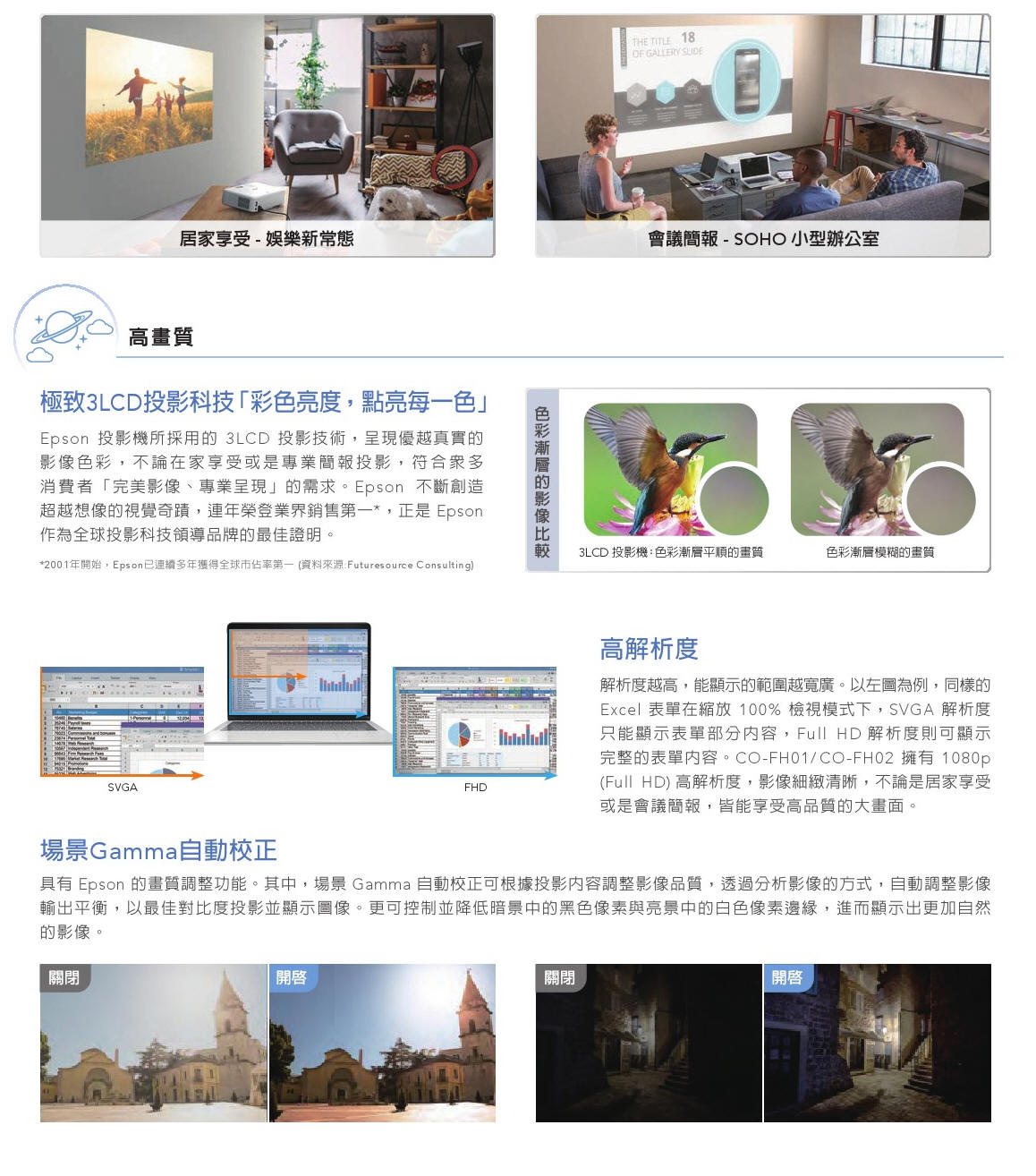 FULL HD(1080P)高畫質解析度,Epson CO-FH02具備Gamma自動校正功能,畫面細膩自然,大螢幕視覺享受不打折。