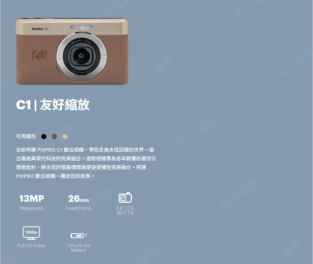 【型號】Kodak 柯達 PIXPRO C1 可翻轉螢幕隨身型數位相機(1300萬畫素)