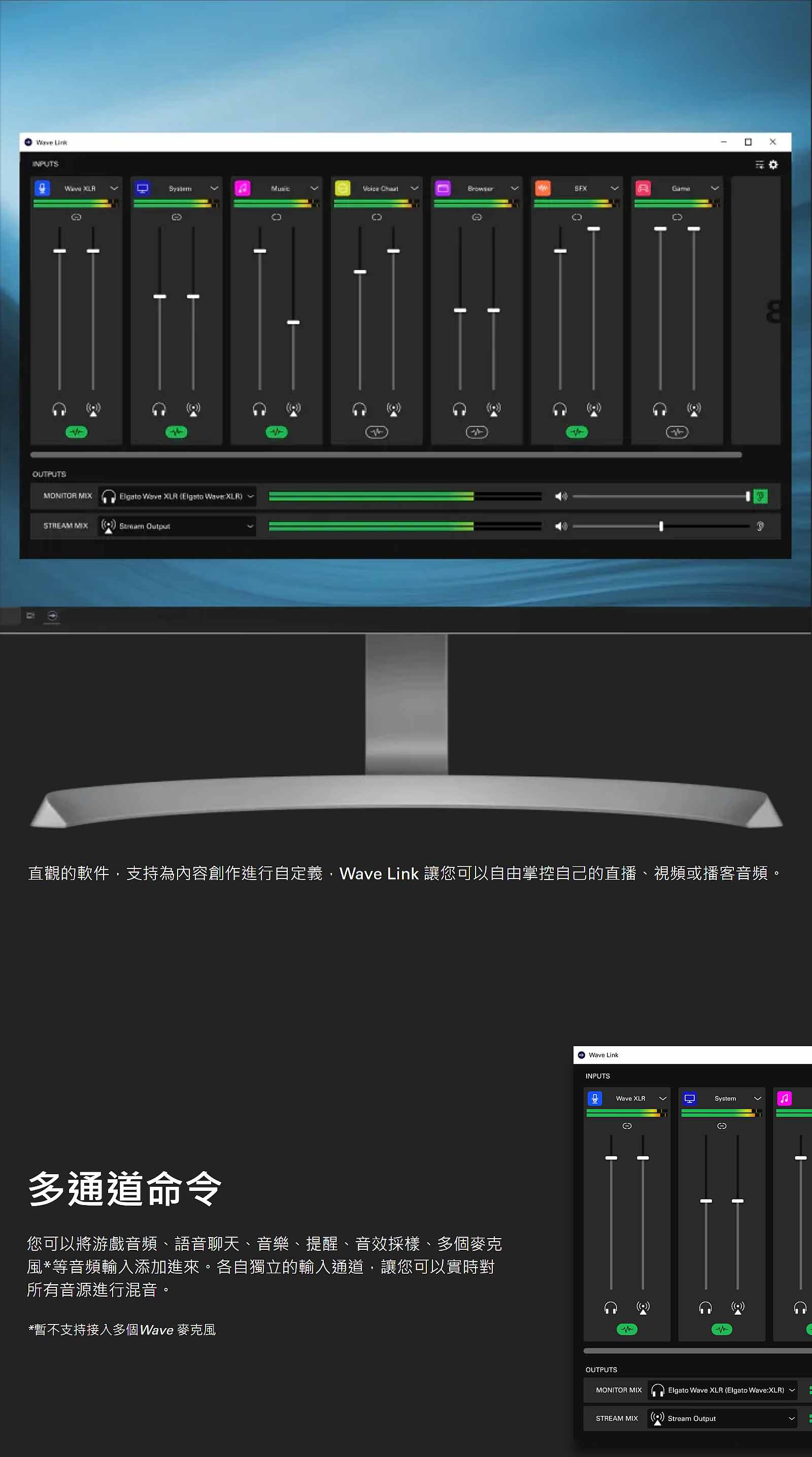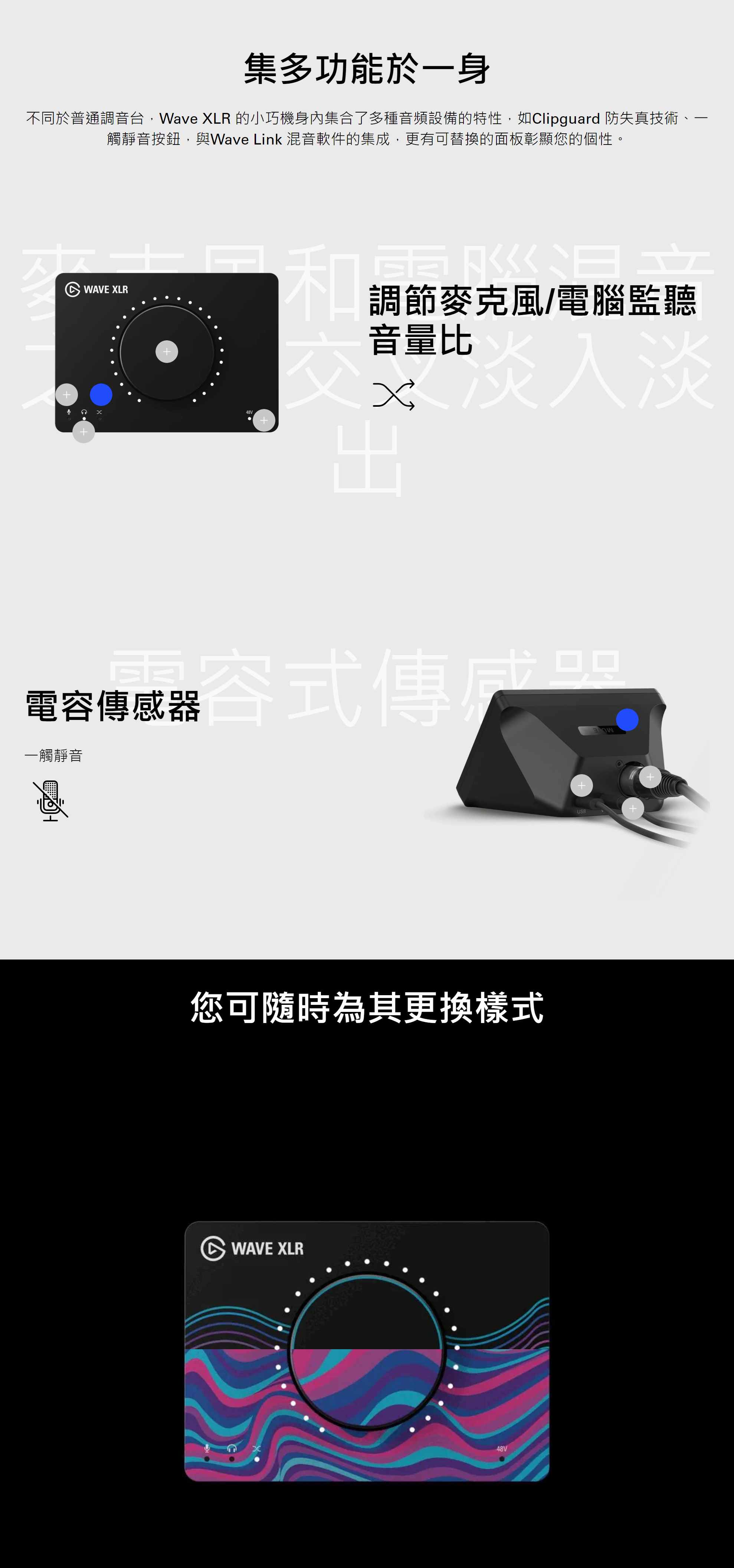 不同於普通混音器,Wave XLR 的小巧機身內集合了多種音頻設備的特性,如Clipguard 防失真技術、一觸靜音按鈕,與Wave Link 混音軟體的集成,更有可替換的面板彰顯您的個性。