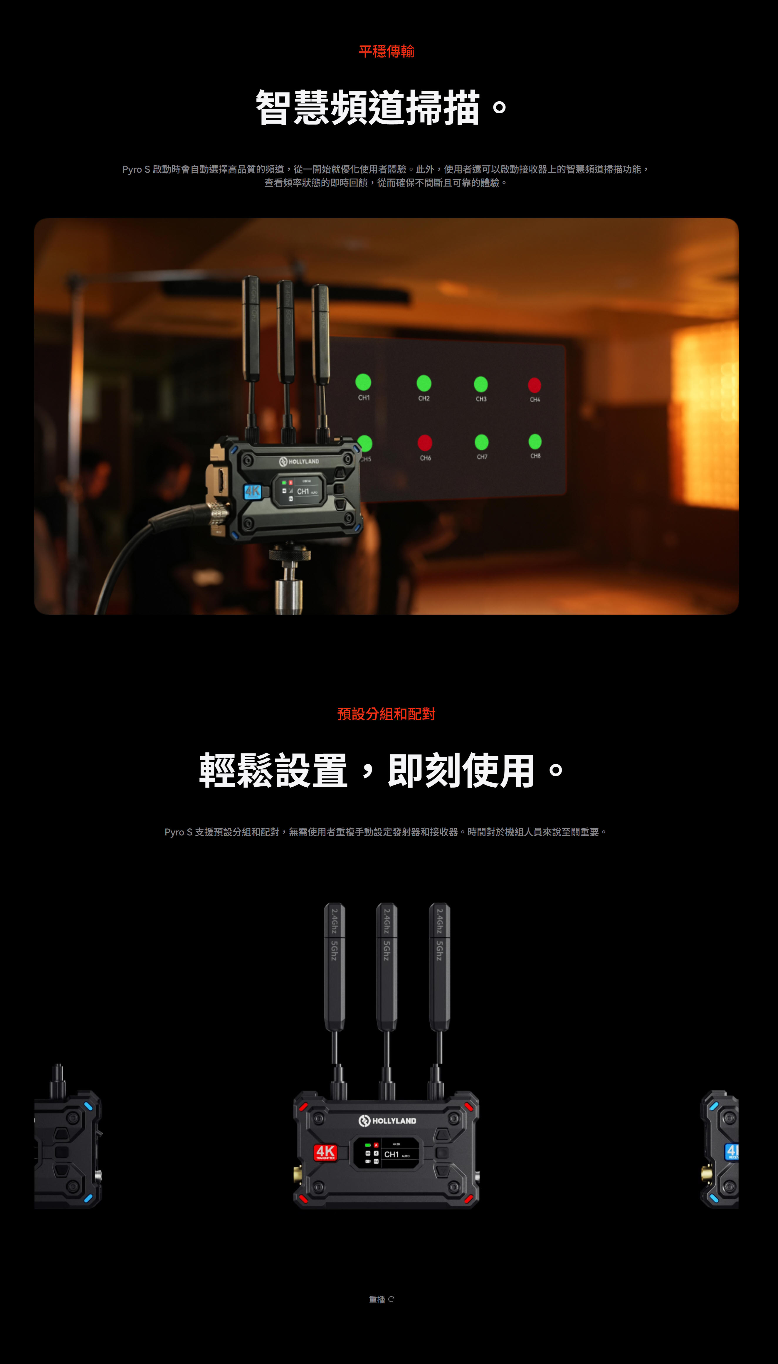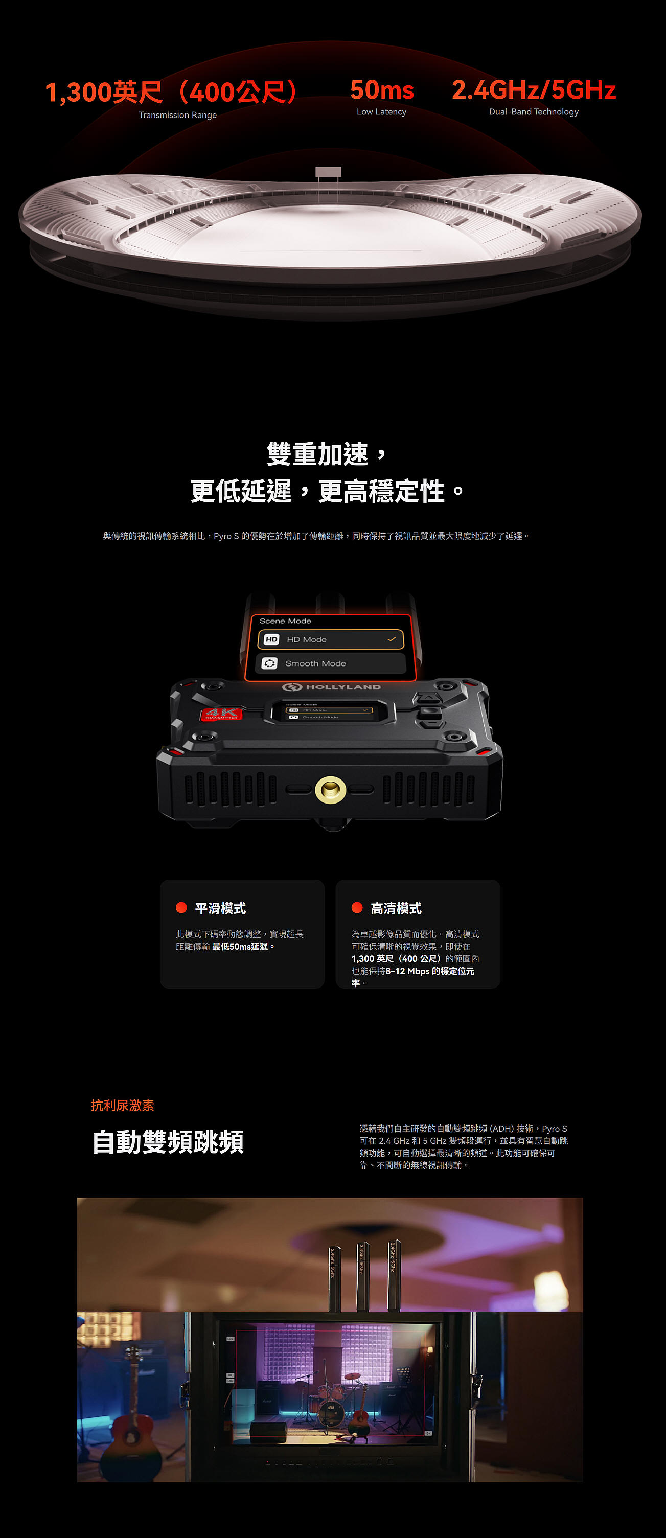 輸入/輸出,可同時向最多四個接收器傳輸,傳輸範圍高達 1,300 英尺(400 公尺),最低延遲僅 50 毫秒。 Pyro S 採用先進的自動雙頻跳頻 (ADH)