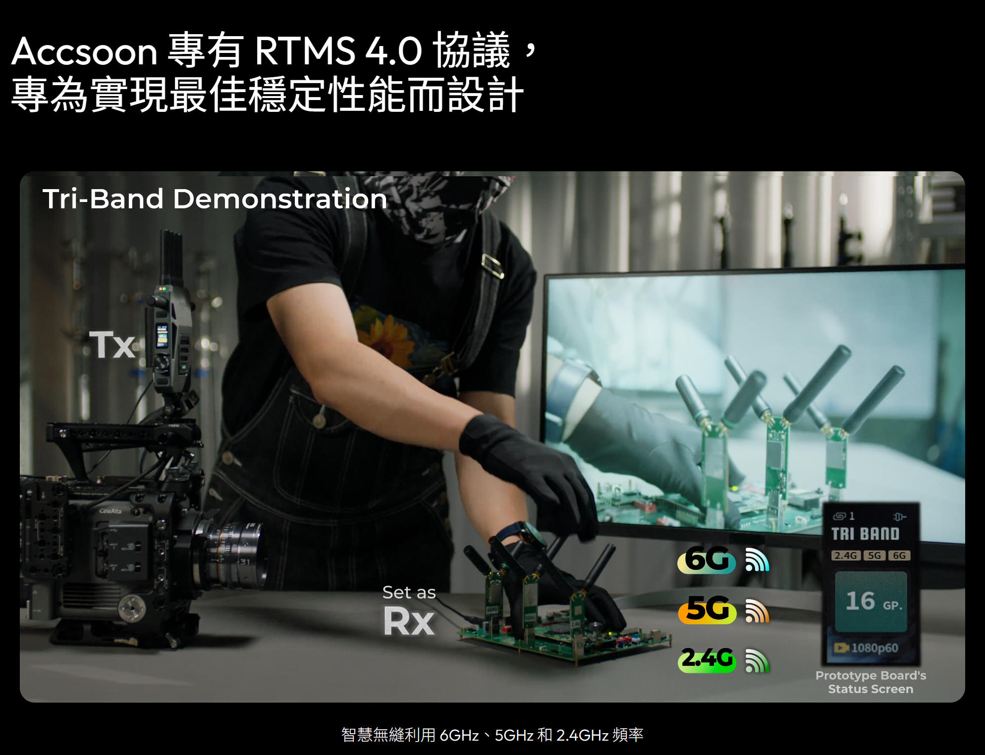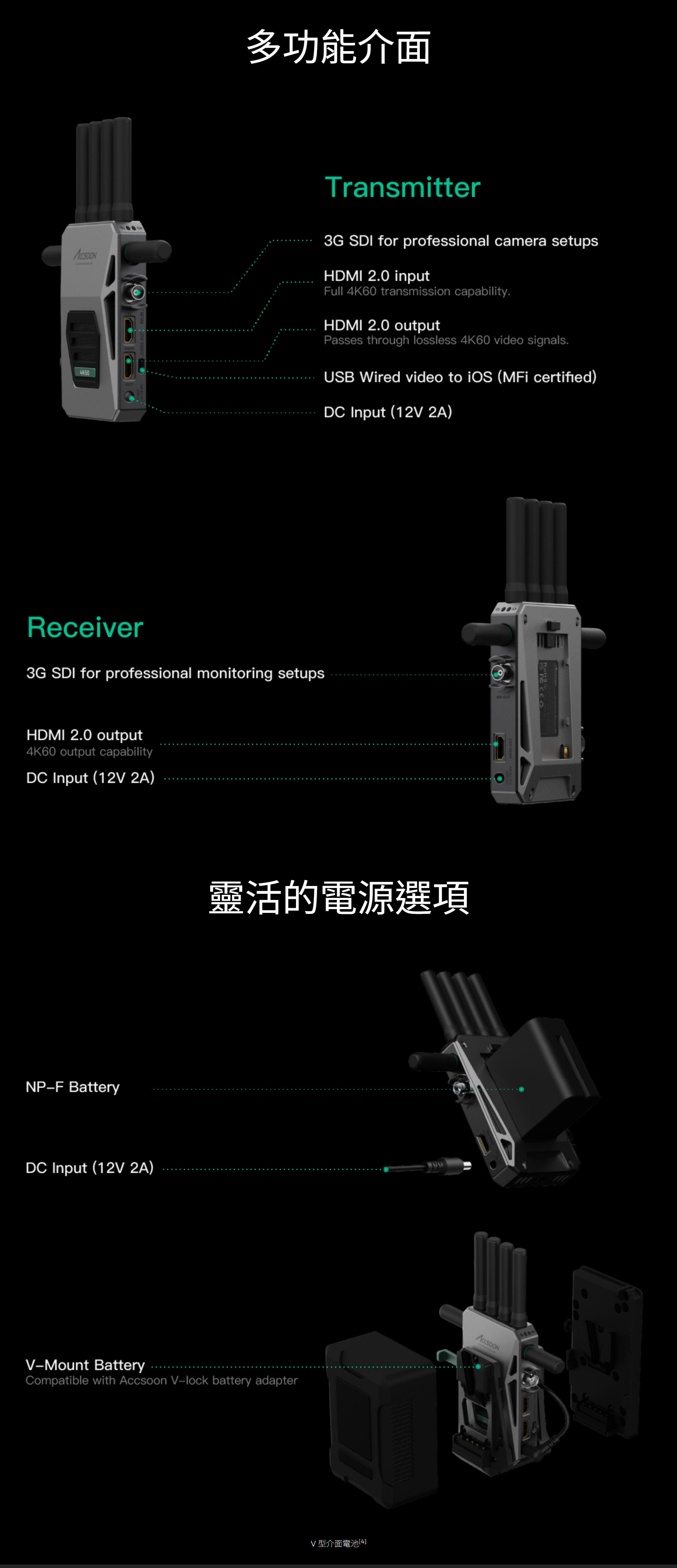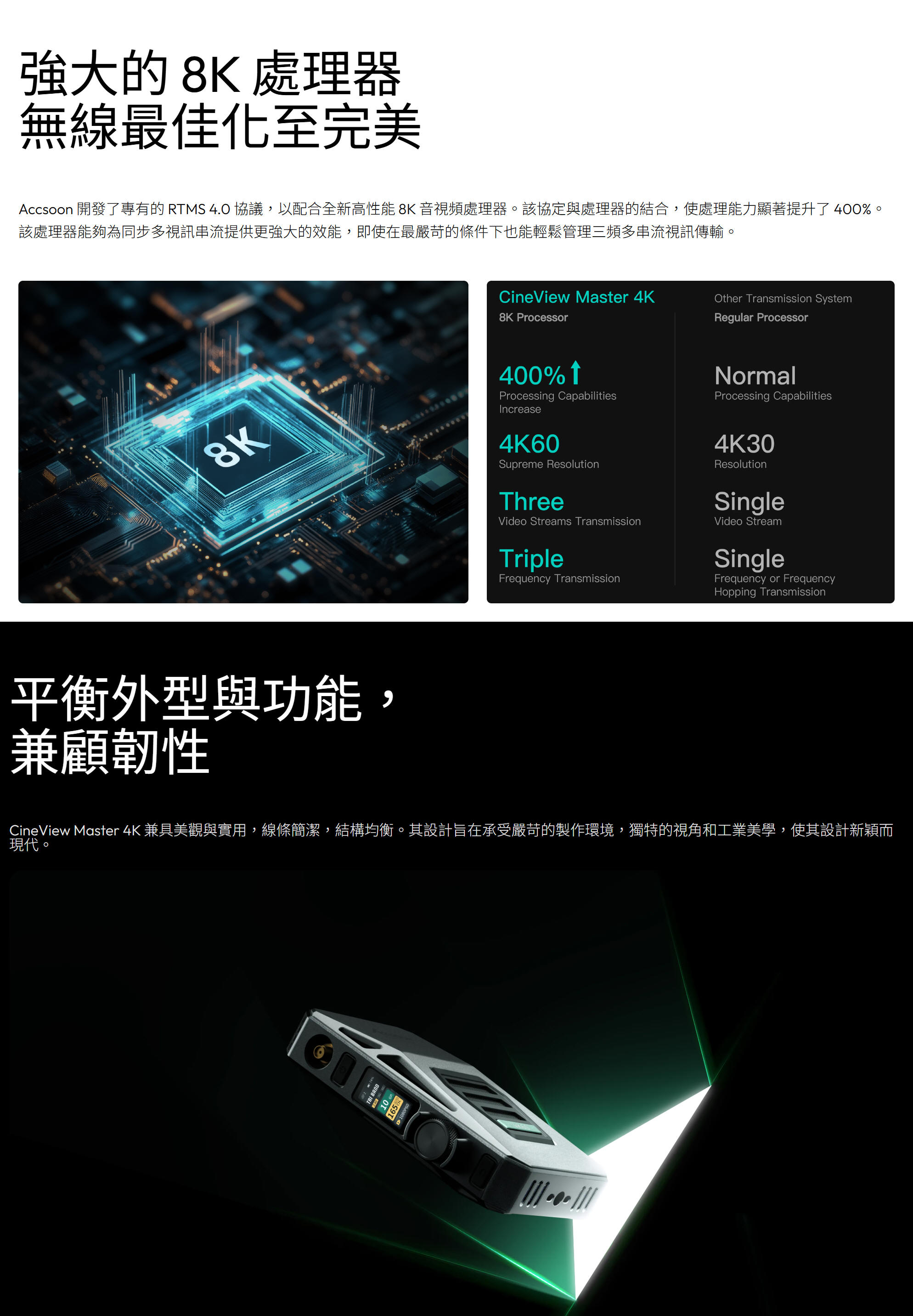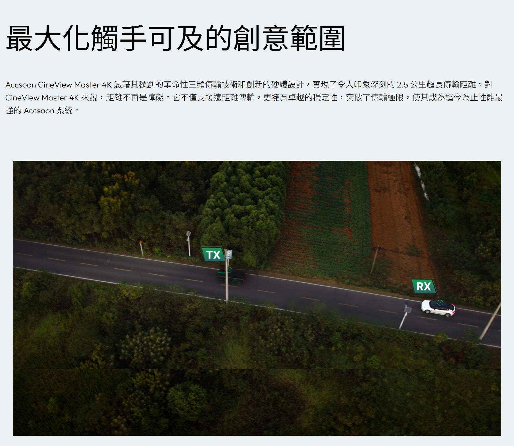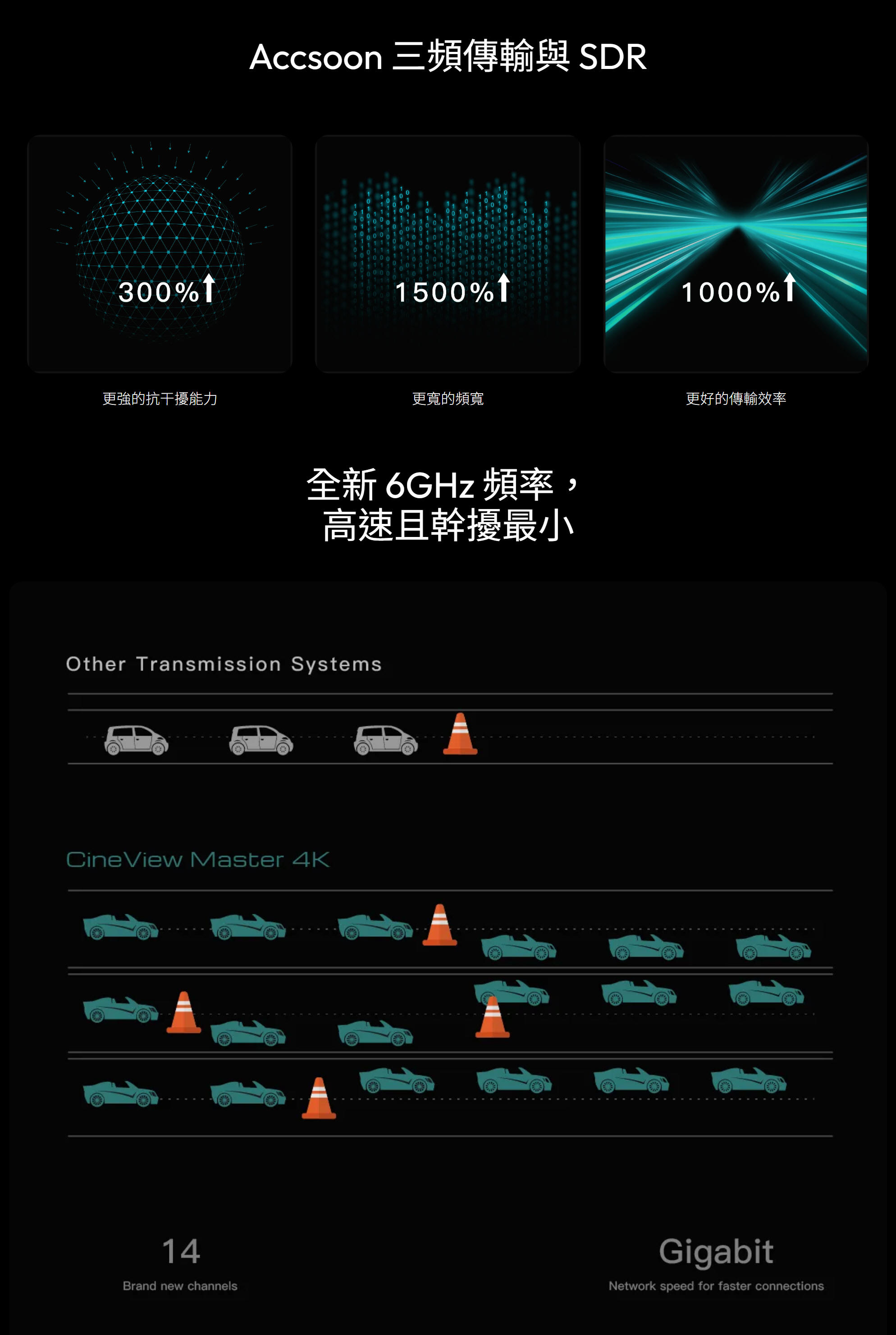 全新6GHz,多一頻更從容 公司貨 限量送F770電池*2、USB雙槽充電器 影眸大師 4K 2.5公里遠距離傳輸 8K高性能外理器 智能溫控散熱 蘋果MFi認證視頻傳輸 多碼流同時傳輸 RTMS 4.0 致迅自研通訊協議 影眸大師 4K 憑藉獨創的三頻傳輸技術與革命性的硬體架構設計,以實力突破 2.5 公里超長傳輸距離。無懼佈線束縛,無懼信號 干擾,輕鬆應對超遠距離監看需求,更穩定,更流暢。 相關資料: Accsoon影眸CineView 4K 大師版無線圖傳說明書 (檔案大小:2MB)