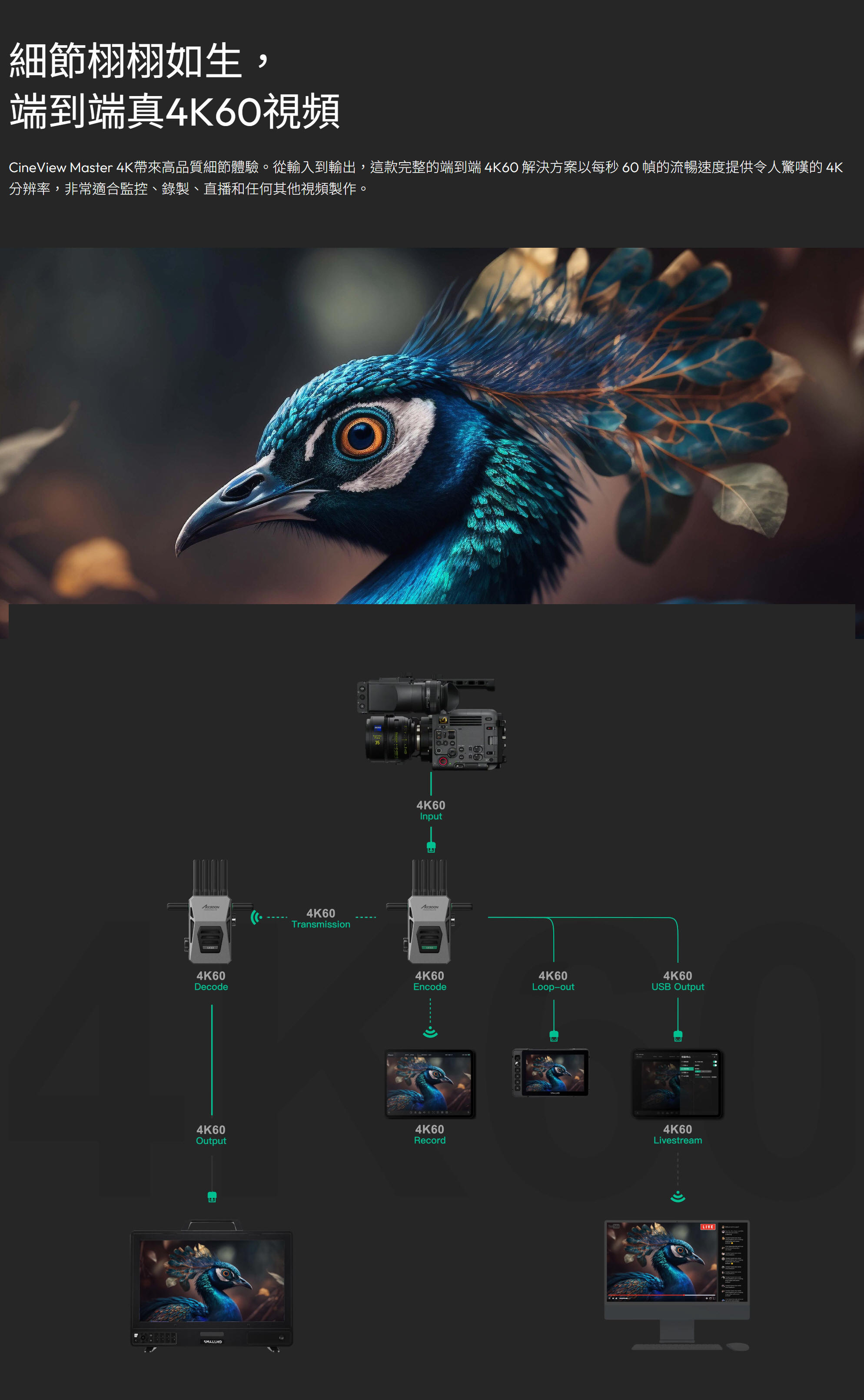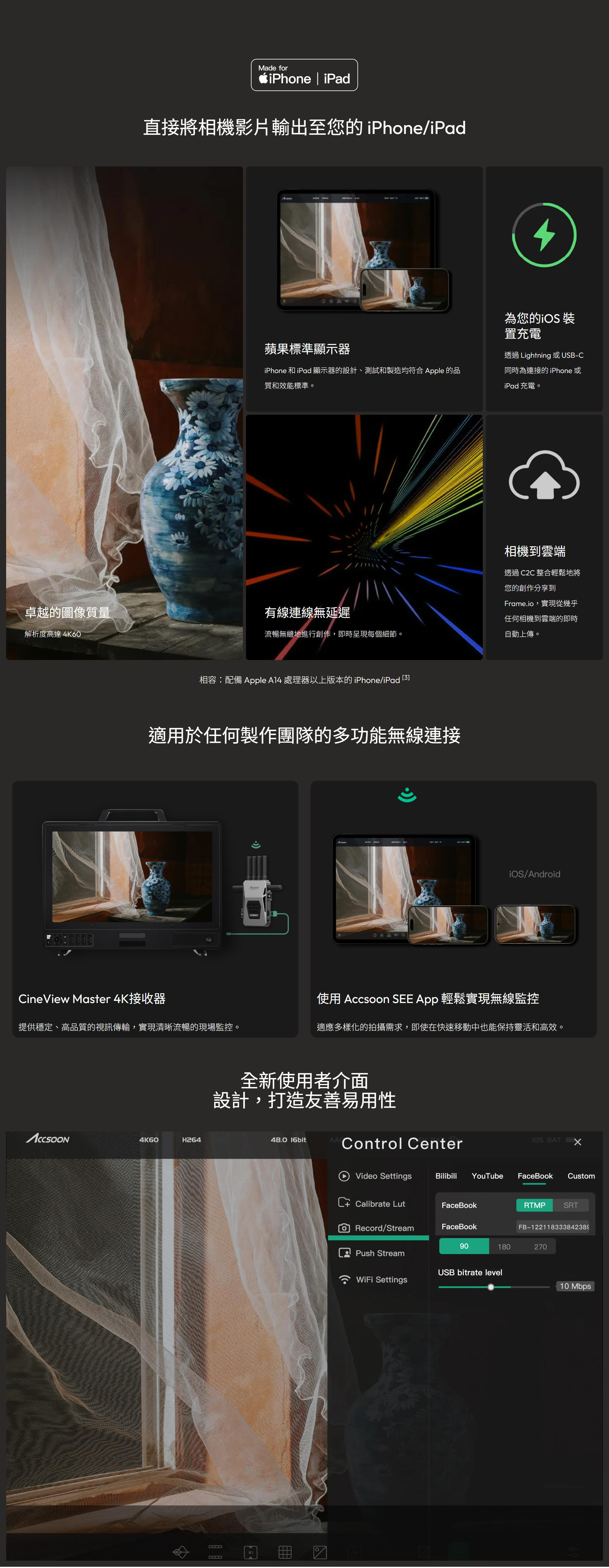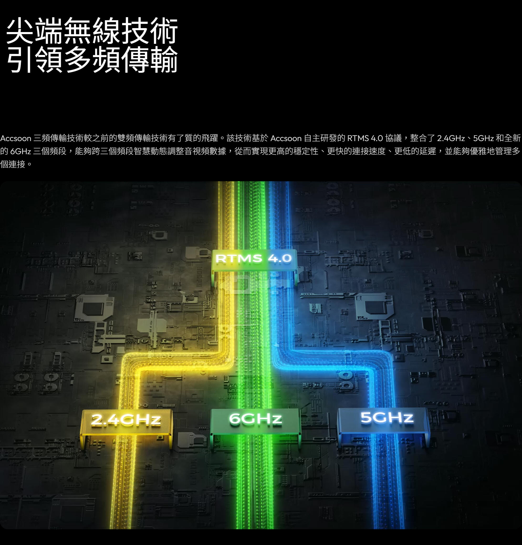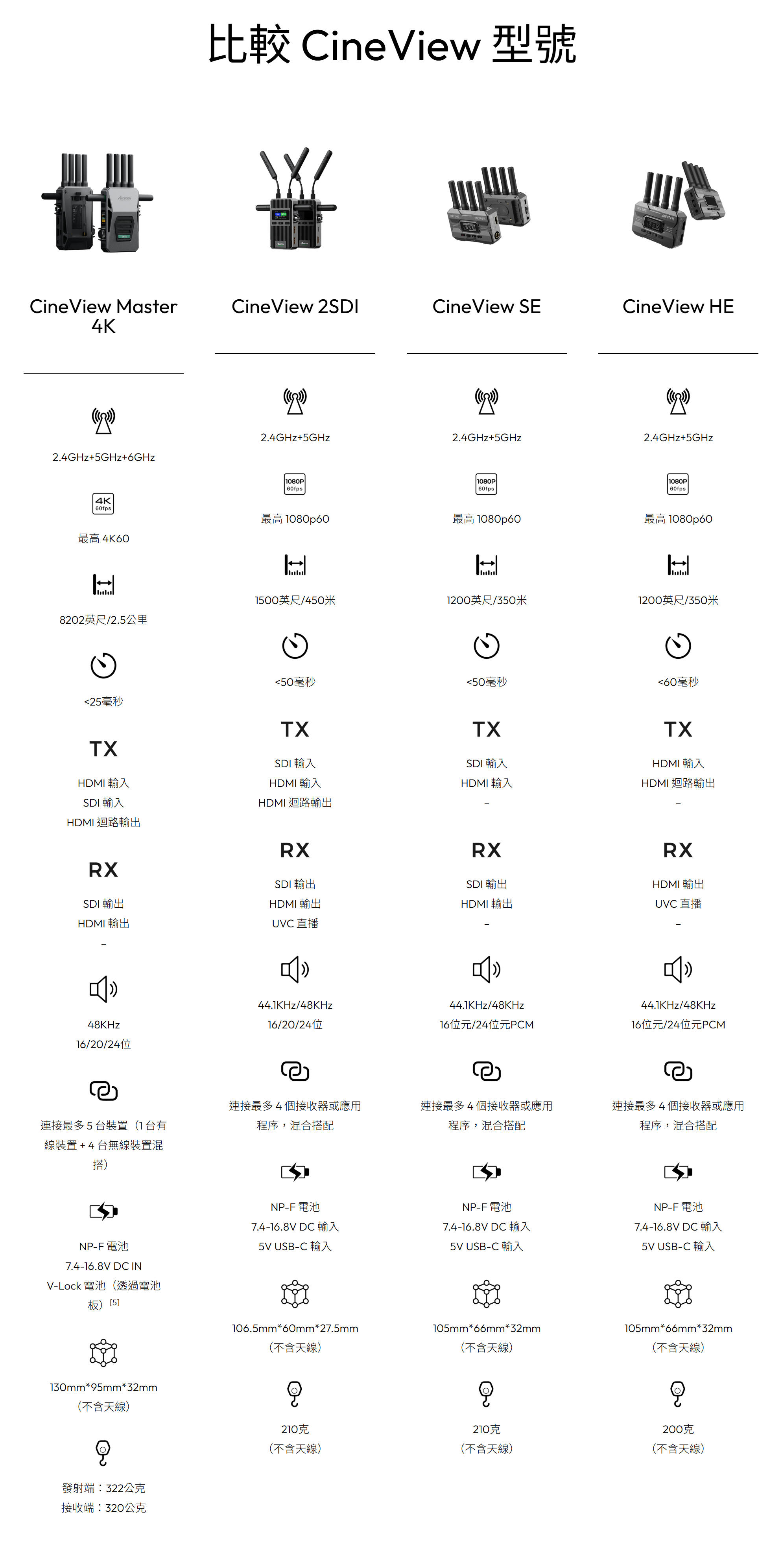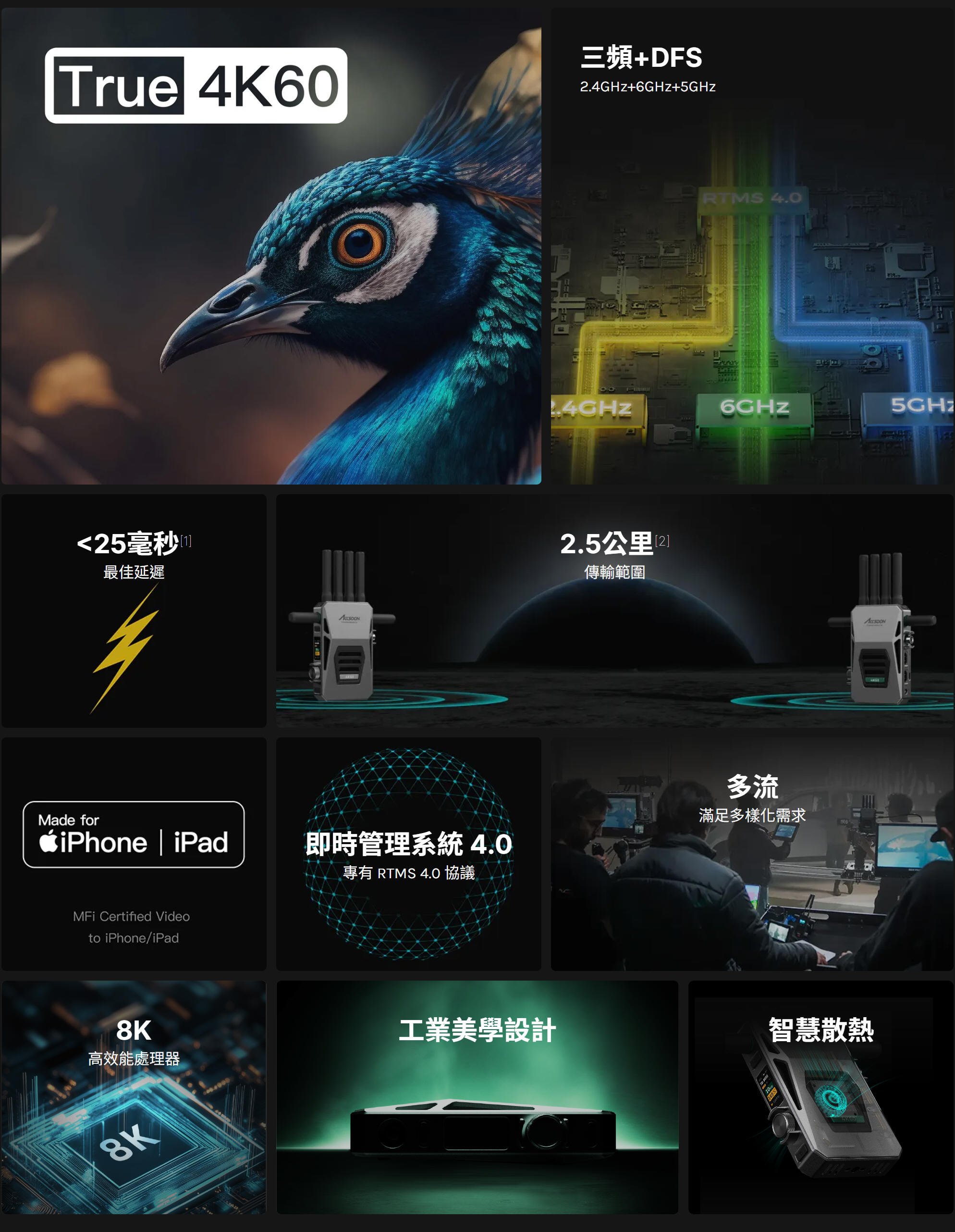 全新6GHz,多一頻更從容 公司貨 限量送F770電池*2、USB雙槽充電器 影眸大師 4K 2.5公里遠距離傳輸 8K高性能外理器 智能溫控散熱 蘋果MFi認證視頻傳輸 多碼流同時傳輸 RTMS 4.0 致迅自研通訊協議 影眸大師 4K 憑藉獨創的三頻傳輸技術與革命性的硬體架構設計,以實力突破 2.5 公里超長傳輸距離。無懼佈線束縛,無懼信號 干擾,輕鬆應對超遠距離監看需求,更穩定,更流暢。 相關資料: Accsoon影眸CineView 4K 大師版無線圖傳說明書 (檔案大小:2MB)