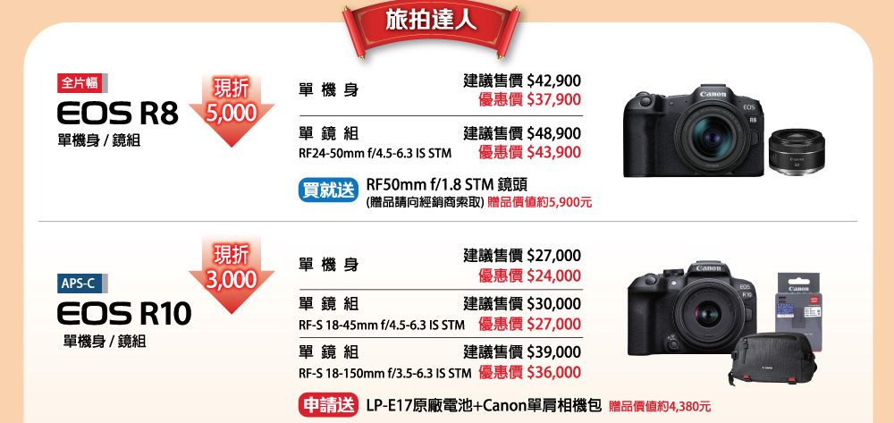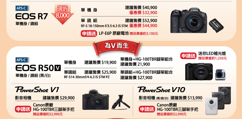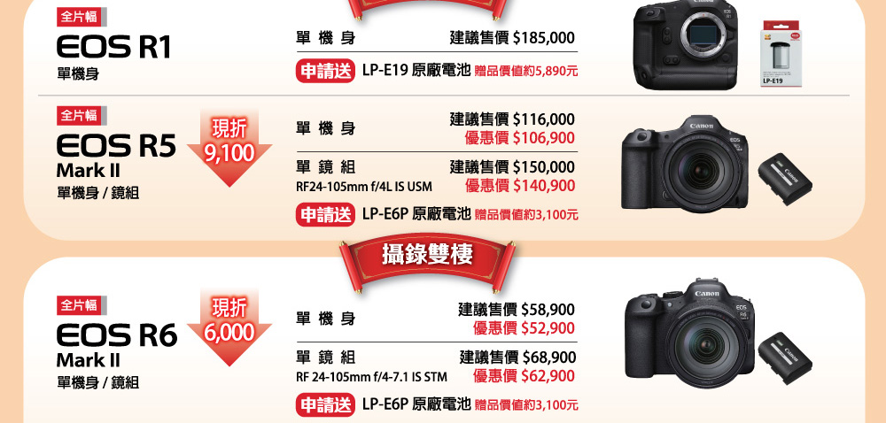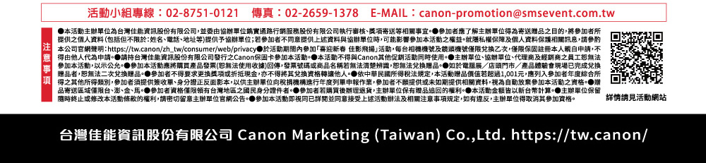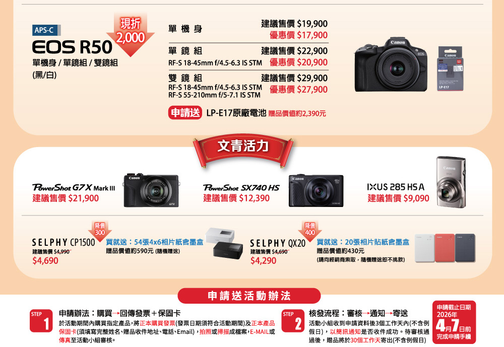 蘋果網銷售的CANON相機皆為總代理公司貨,優惠同原廠(總代理)活動,優惠活動期間、範圍、活動方式依原廠(總代理)為主,如有變更怒不另外通知