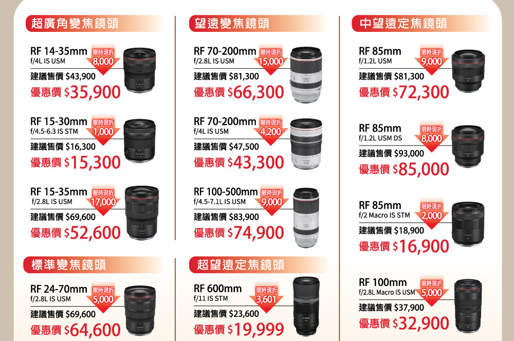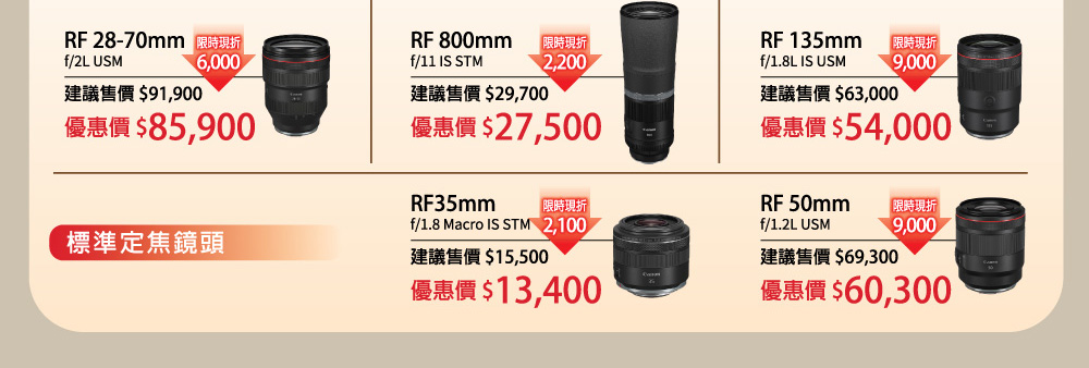 蘋果網銷售的CANON鏡頭皆為總代理公司貨,優惠同原廠(總代理)活動,優惠活動期間、範圍、活動方式依原廠(總代理)為主,如有變更怒不另外通知
