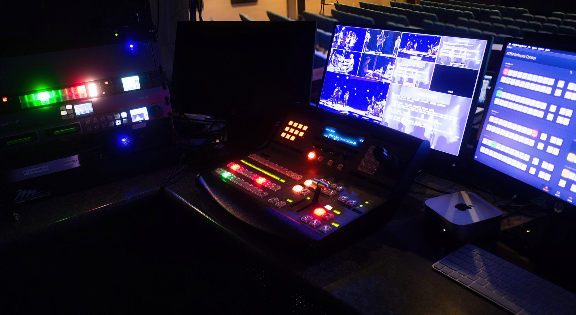 G2數位電影攝影機,通過禮拜堂後方的SDI面板將信號發送回製作間。製作間內設有機架,配備了ATEM 2 M/E Constellation HD和ATEM 1